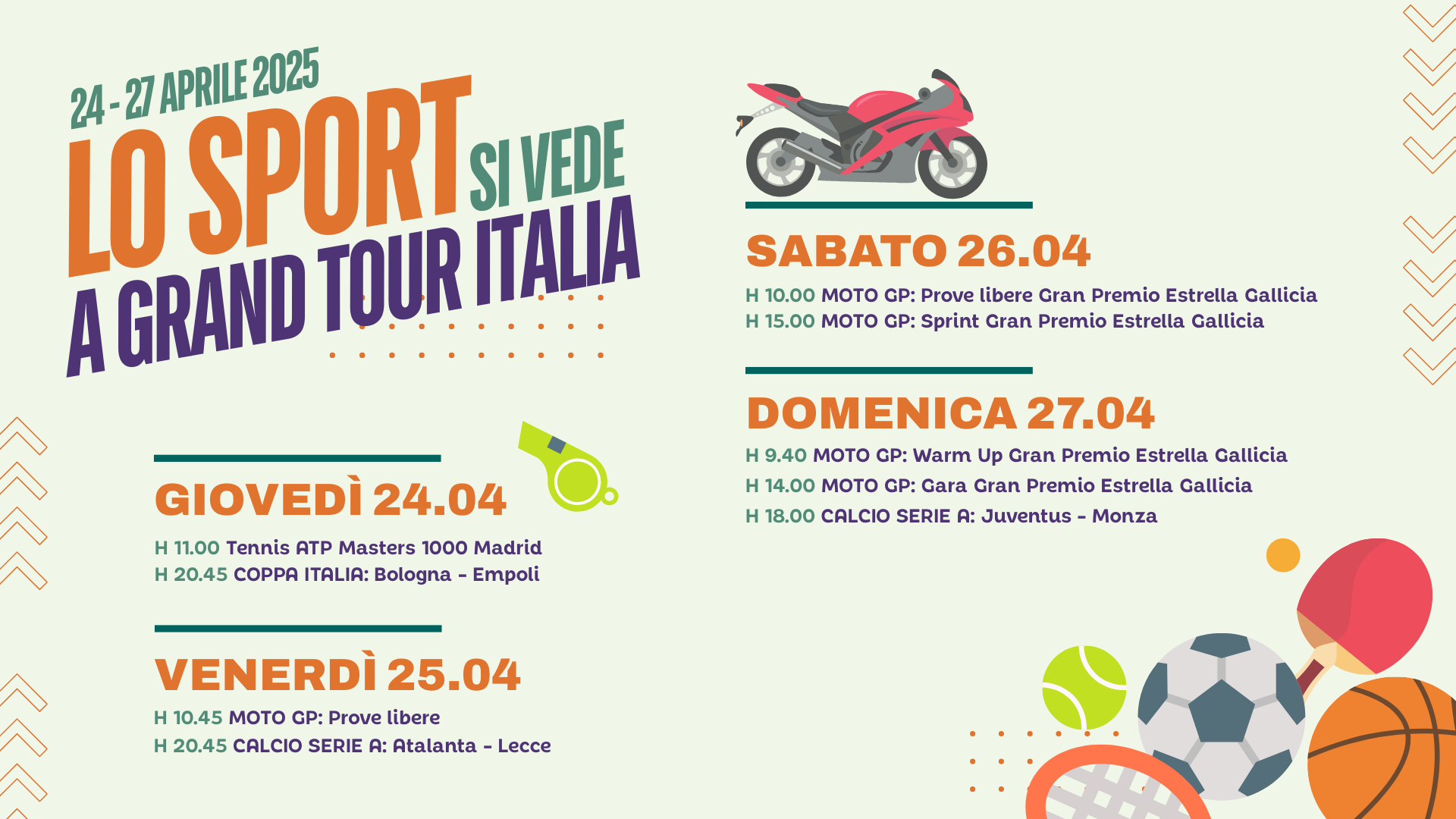 Sai che puoi goderti tutto lo sport Sky a Grand Tour Italia? Scopri il palinsesto delle partite di calcio, della F1, di moto GP e di basket!