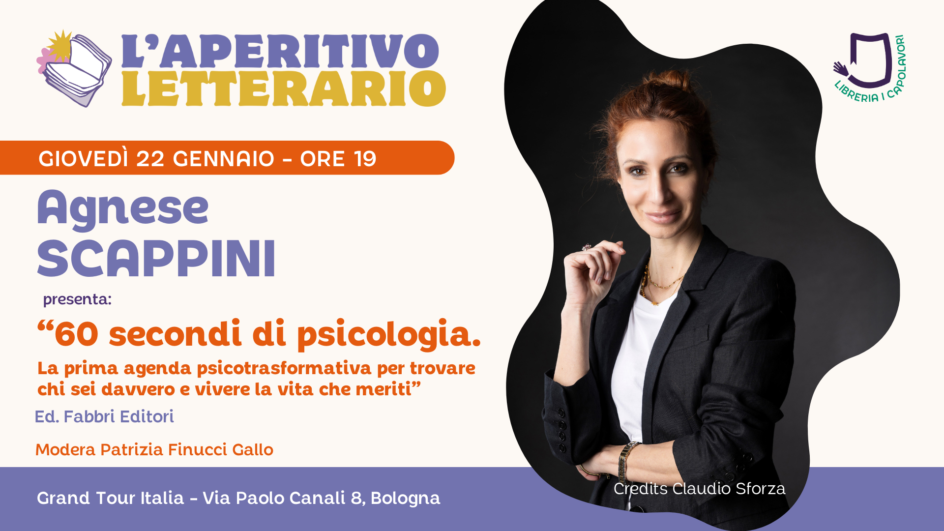 Giovedì 22 gennaio alle ore 19.00 Agnese Scappini presenterà il suo libro “60 secondi di psicologia. La prima agenda psicotrasformativa per trovare chi sei davvero e vivere la vita che meriti “ (casa editrice Fabbri Editori).