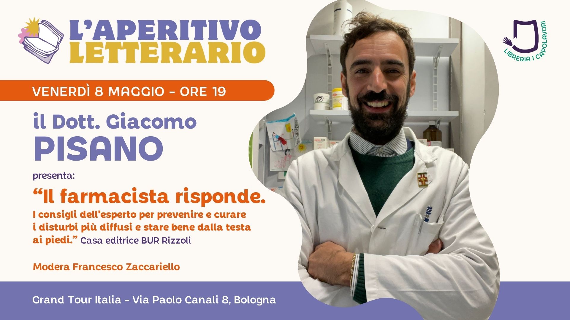 Venerdì 8 maggio alle ore 19.00 il Dottor Giacomo Pisano (noto su IG come @il_socialmente_farmacista) presenterà il suo libro “Il farmacista risponde. I consigli dell'esperto per prevenire e curare i disturbi più diffusi e stare bene dalla testa ai piedi” (casa editrice BUR Rizzoli).