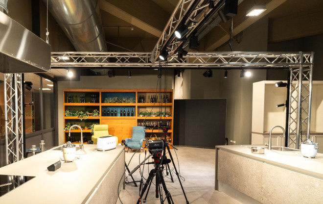 Un vero studio di registrazione audio e video con due cucine a isola, area salottino, area pubblico e un backstage con regia.