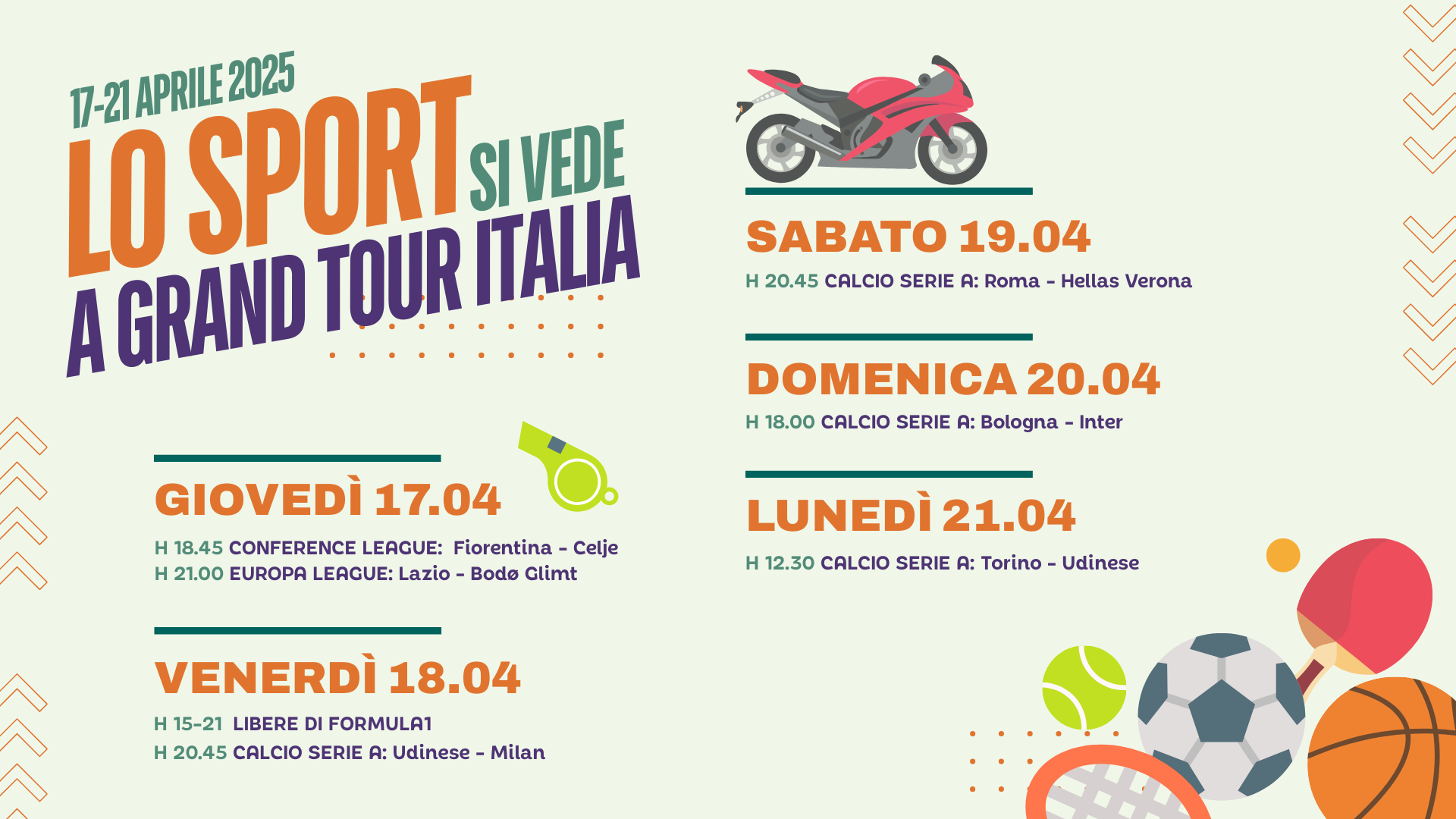 Sai che puoi goderti tutto lo sport Sky a Grand Tour Italia? Scopri il palinsesto delle partite di calcio, della F1, di moto GP e di basket!