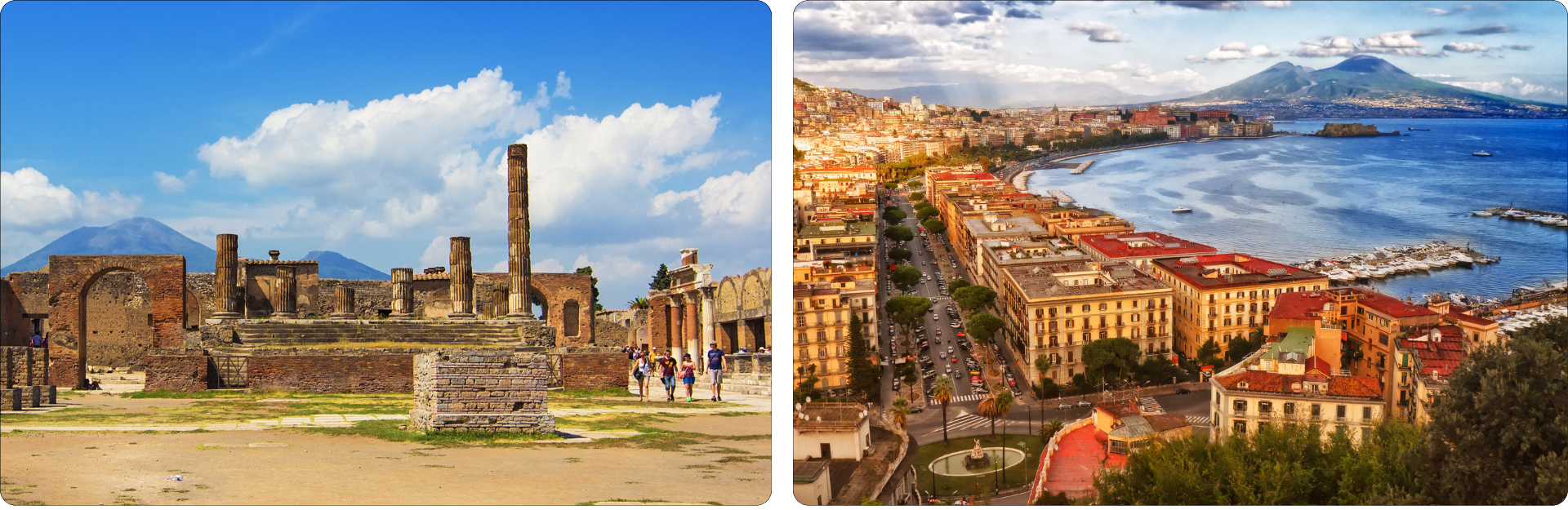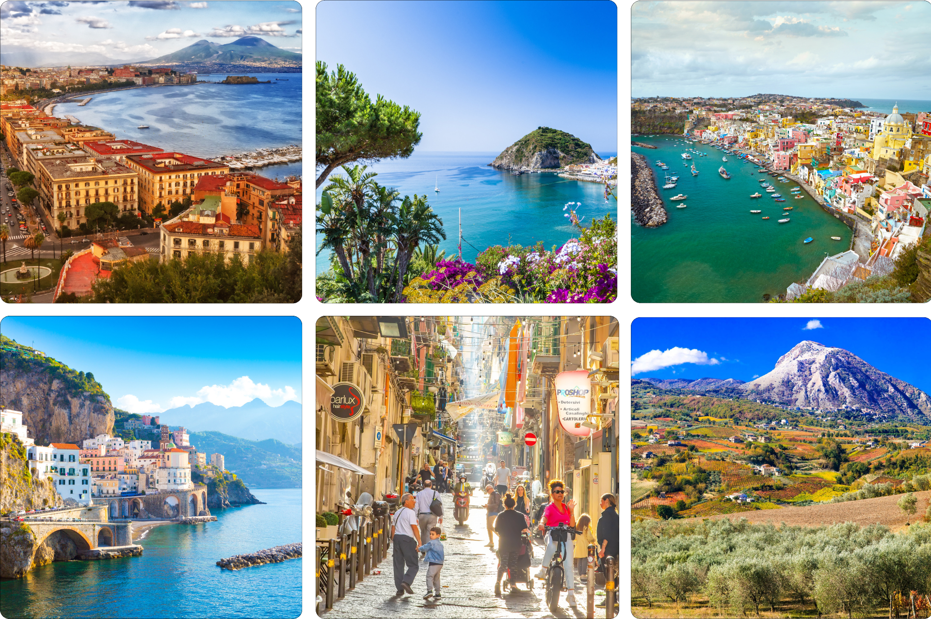 La Campania è ricca di siti archeologici e monumenti che narrano la sua lunga storia. Pompei ed Ercolano, sepolte dall'eruzione del Vesuvio nel 79 d.C., offrono uno spaccato unico della vita quotidiana nell'antica Roma. Altri siti di rilievo includono la Reggia di Caserta, con i suoi giardini all'italiana, e la Costiera Amalfitana, famosa per i suoi paesaggi mozzafiato e i pittoreschi villaggi costieri. La ricchezza culturale della Campania è ulteriormente arricchita da Napoli, con il suo storico centro, il Monastero di Santa Chiara e la vivace Via San Gregorio Armeno.