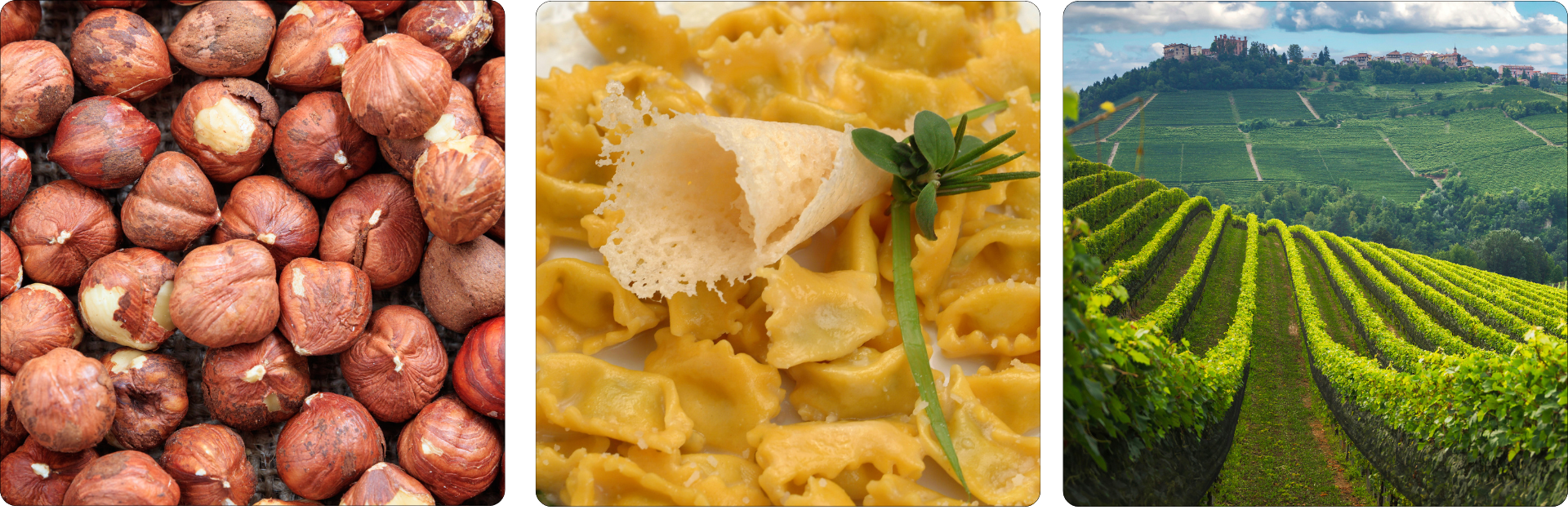 La cucina piemontese riflette l'incontro tra la cucina nobile dei Savoia e quella popolare contadina. È nota per piatti come la Bagna càuda, gli agnolotti, la fonduta con tartufo, oltre a vini pregiati come Barolo e Barbaresco. La produzione di nocciole e il famoso tartufo bianco di Alba sono anch'essi elementi distintivi della gastronomia regionale.