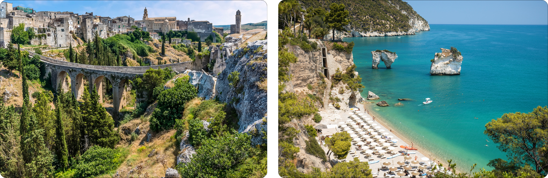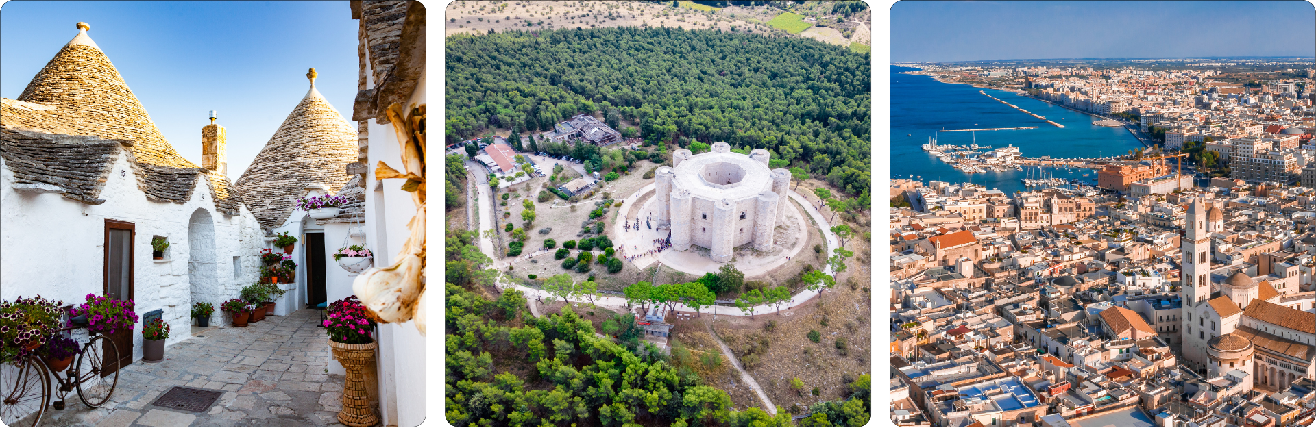 La Puglia è casa di tre siti UNESCO: Castel del Monte, i trulli di Alberobello e il Santuario di San Michele Arcangelo. Ogni provincia offre luoghi di interesse unici, dalle chiese e castelli di Bari e Lecce, al patrimonio barocco e alle antiche testimonianze greche e romane che arricchiscono la regione.