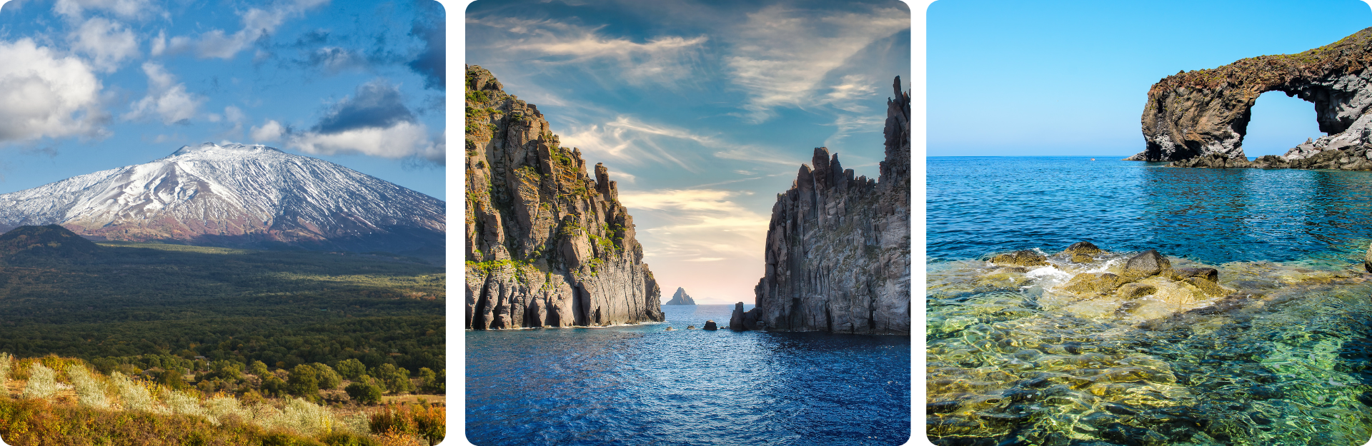 La Sicilia vanta una natura sorprendentemente variegata, dalle maestose vette dell'Etna, il vulcano attivo più alto d'Europa, alle idilliache spiagge di Cefalù e San Vito Lo Capo. Le Isole Eolie, con la loro bellezza selvaggia, sono un paradiso per gli amanti della natura. Questi paesaggi, tra terra e mare, offrono scenari mozzafiato e sono il cuore pulsante dell'identità siciliana, attirando visitatori da tutto il mondo.